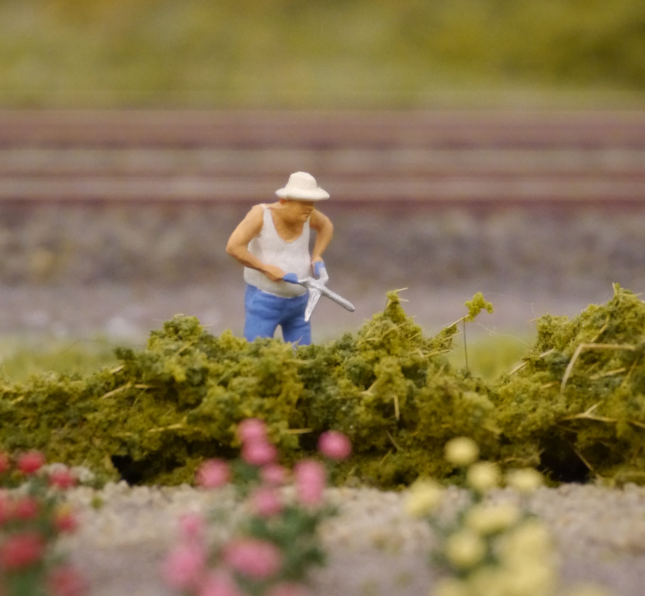 Während der Gleisbau und die Elektronik weit fortgeschritten sind, nimmt die Anlage jetzt auch optisch Gestalt an. Dabei wird je nach Eignung alles verbaut, was geeignet erscheint: Gips, Drahtgitter, Papier, Styrodur, Matten, Flocken, Steinschotter, selbstgefertigte und gekaufte Modellbotanik, die ggfs. noch eine Nachbehandlung über sich ergehen lassen muss. Gebäude gibt es aus dem Handel wie auch selbstgemacht, wenn z. B. ein bestimmtes Bahnhofsgebäude nachzubilden ist.