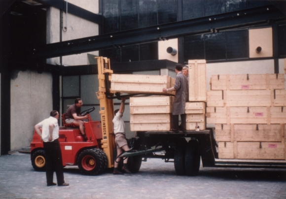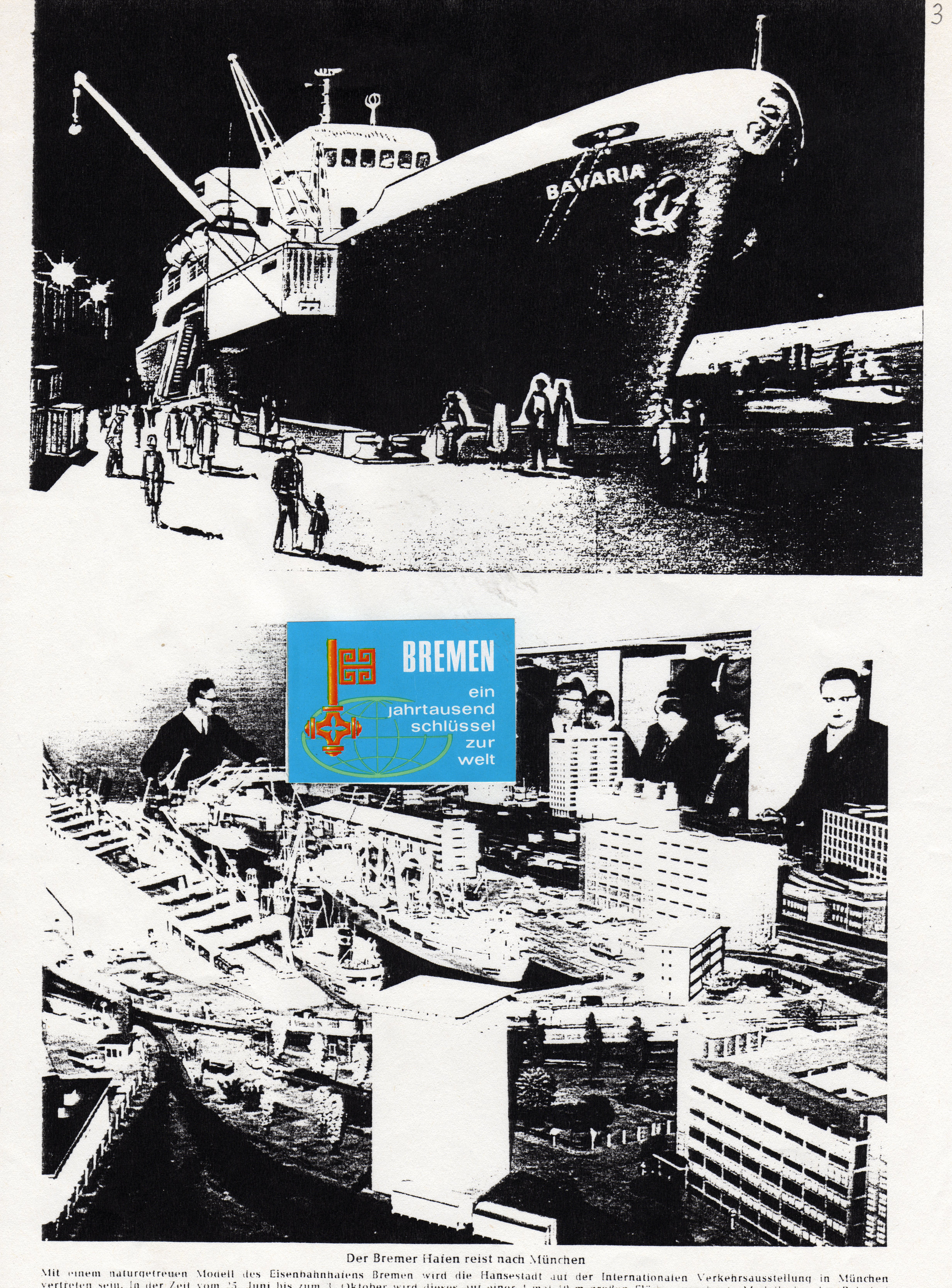Im Juni 1965 wurde die Anlage sorgfältig auseinander genommen und in 52 eigens dafür gefertigten Kisten verpackt. Eine Etage höher hatte die Bundesbahn 2 Waggons dafür bereitgestellt. War bis zu diesem Zeitpunkt alles planmäßig verlaufen, erlitten wir in München einen Schock. 6 Tage waren für den Aufbau vorgesehen, alles in einem Aufbauplan vorgeplant, nur die beiden Waggons waren nicht auf dem Ausstellungsgelände. Ein halber Tag ging verloren, bis wir sie in München-Pasing auf einem Abstellgleis gefun­den hatten. Um sie entladen zu können, mussten wir die Waggons mit eigenen Kräften ein paar hundert Meter verschieben, um an eine Rampe zugelangen. Danach konnten wir „von Hand“ die Kisten auf einen LKW verfrachten und zum Ausstellungsgelände fahren. Zwei Tage waren ausgefüllt mit dieser „Schwerstarbeit“. Statt der 6 Tage wurde nun in 4 Tagen von 8 bis 24 Uhr aufgebaut. In der letzten Nacht sogar bis 3 Uhr früh. Im grellen Licht der Strahler und bei Temperaturen von bis zu 35 Grad fügten wir alles wieder zusammen, wofür wir zuvor 5 Jahre benötigt hatten. Am 26. Juni 1965 war die Eröffnung der IVA 1965. Der damalige Bundespräsident Lübke kam als Erster mit einem großem Gefolge an unsere Anlage und stellte nur eine Frage: „Wo liegt die Bremen?“ !!! (Er wurde dann von seiner Begleitung vertraulich informiert). Danach folgten dann täglich 10-15 Tausend Besucher. Zwischen den Abläufen auf der Anlage lief auf einer Leinwand über dem Modell der fabelhafte Hafenfilm aus Bremen „Anatomie eines Hafens“ des Regisseurs Horst Kaskeline. Die Anlage war ständig von zwei Mitgliedern des MEC Bremen besetzt. Alle 14 Tage wurde gewechselt, bis zum 3. Oktober 1965.