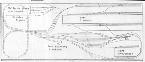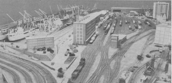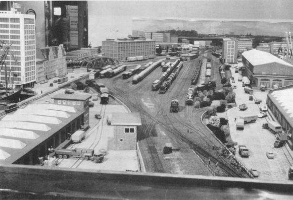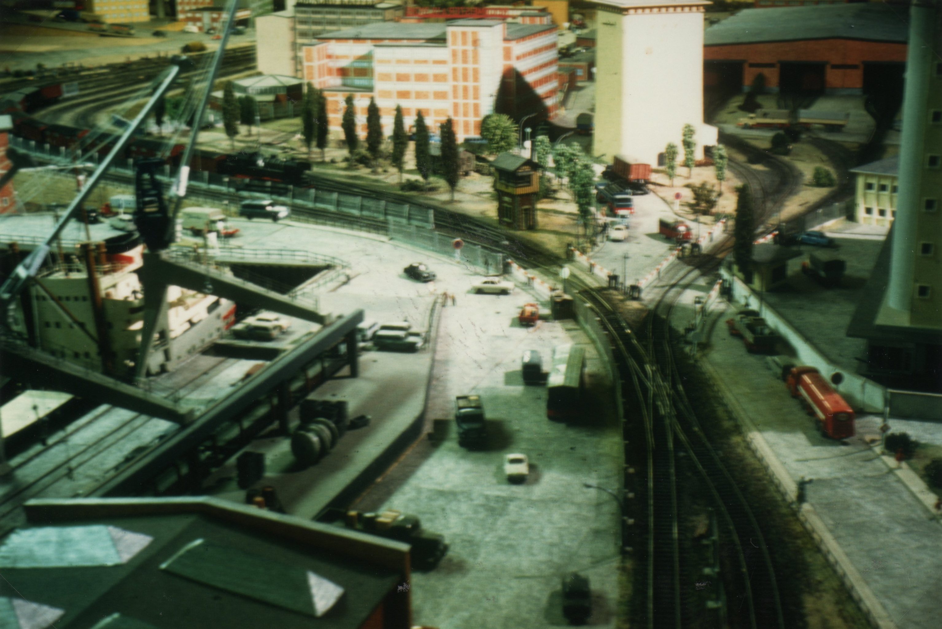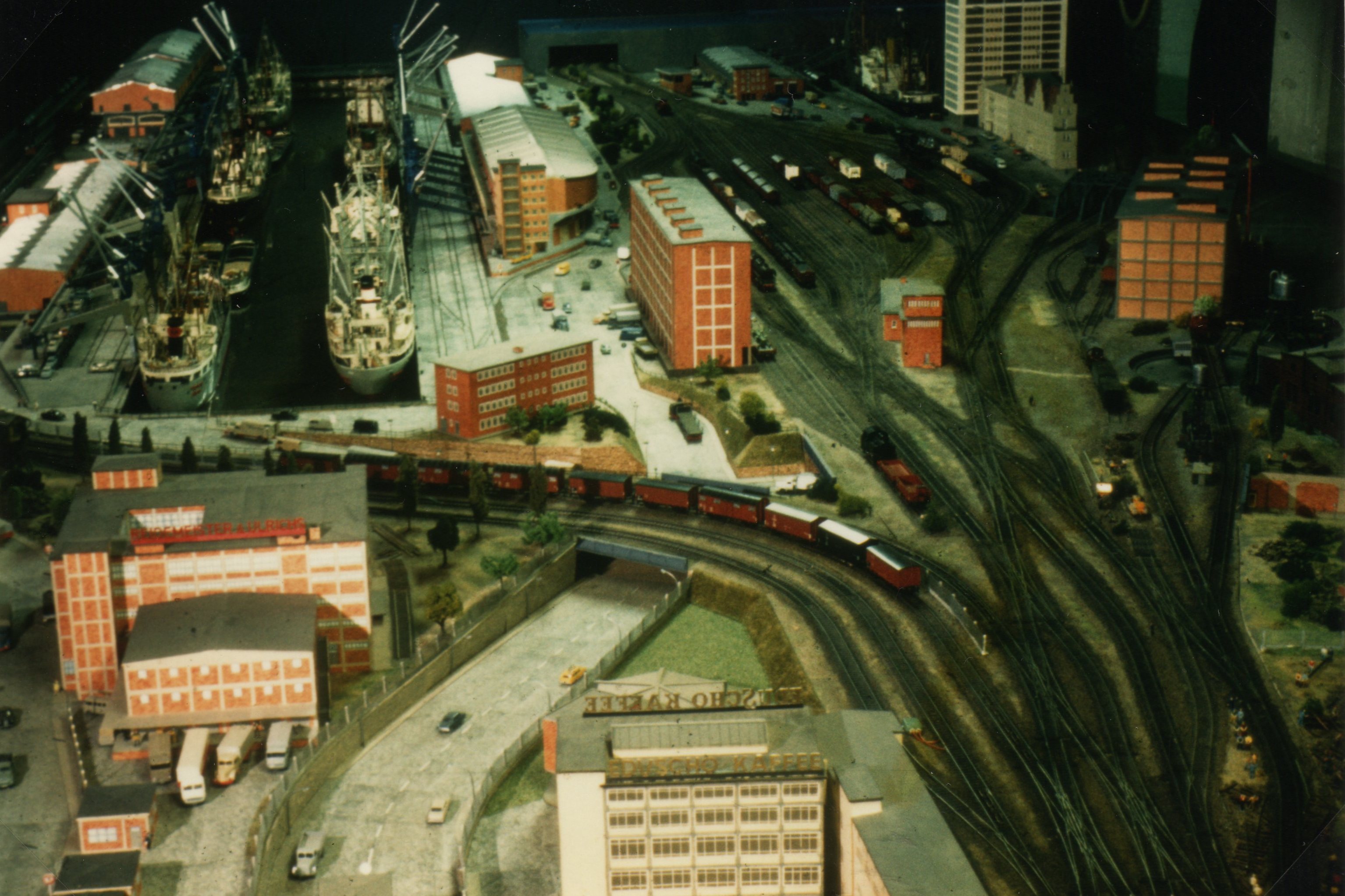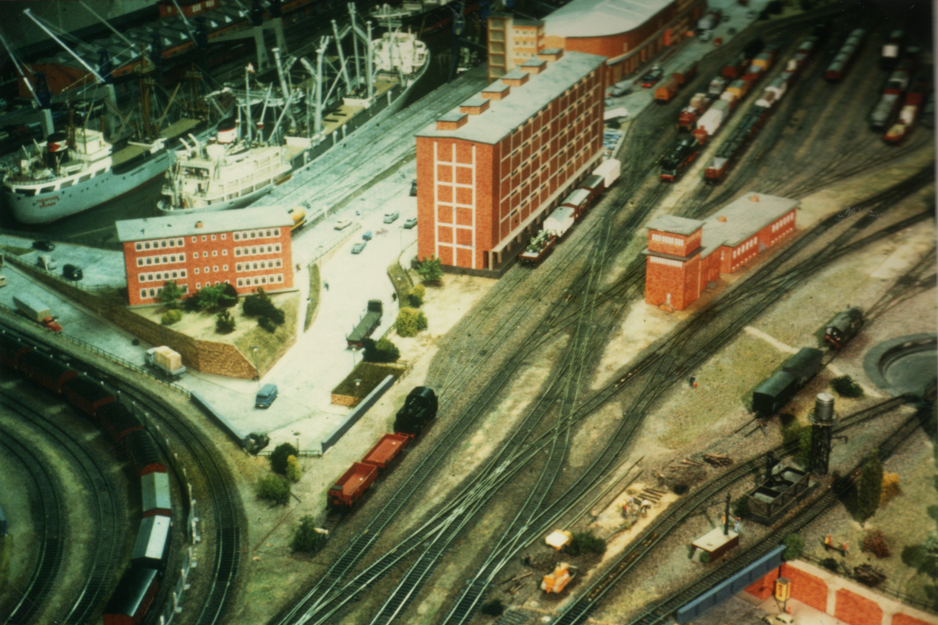 im Europahafen zeigte. Mit den Ausmaßen von 4 x 10 Metern war es damals vermutlich die größte Modell-Rangieranlage Europas. In rund 10.000 Arbeitsstunden wurden auf dieser Anlage bis ins kleinste Detail Hochbauten, u.a. Schuppen, Speicher, Hafenhochhaus und Industrie- sowie Lagerhausbauten einschließlich der Kräne naturgetreu nachgebaut. Das Untergestell der Anlage wurde im Bahnhof Bremen-Neustadt im Winter 1960/61 begonnen. Kurz danach stellte uns aber die Deutsche Bundesbahn im Betriebsgebäude des Güterbahnhofes am Hauptbahnhof angemessene Kellerräume zur Verfügung, die nach dem Aufbau auch als Clubräume des MEC Bremen e.V. dienten. Die Auftraggeber dieser Demon­strationsanlage waren der Senator für Häfen, Schifffahrt und Verkehr, die Lagerhaus-Gesell­schaft und die Gesellschaft für Wirtschaftsförderung. Bremen war bestrebt, seinen Charakter als Eisen­bahnhafen herauszustellen und auf die Vorteile hinzuweisen, die wegen der engen Verbindung zwischen Schiene und Seeschiff gegeben waren.