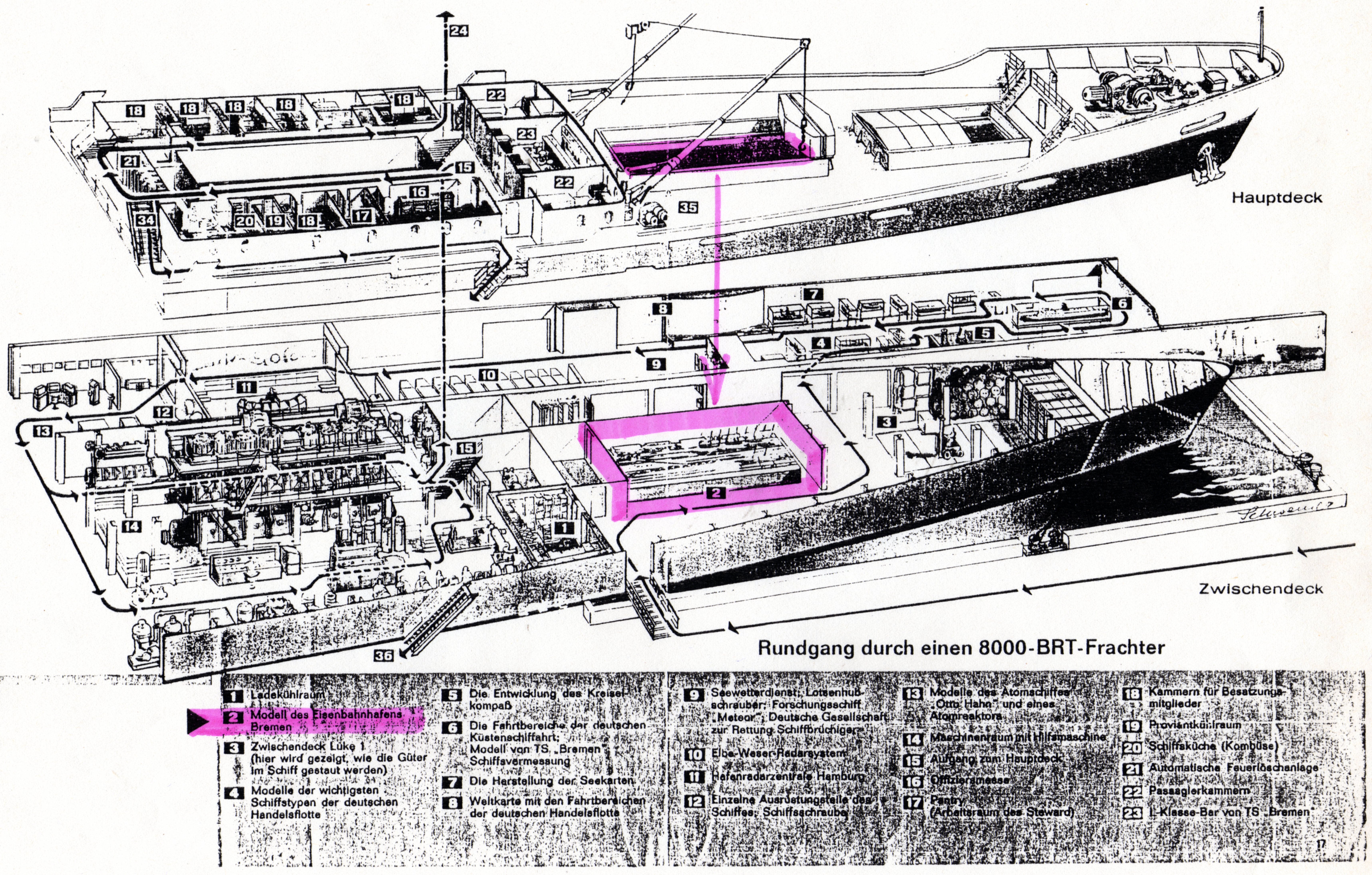 In den mit Wasser gefüllten Hafenbecken lagen neun große Übersee­frachter. Auf den Kajen, dem Bahnhof Zollausschluß, dem Weserbahn­hof waren 250 m Gleise verlegt. Neun Lokomotiven rangierten 250 Eisenbahnwaggons und 450 Autos belebten die Straßen, die schon in der Form der künftigen Planung angelegt waren. Ein vollautomatischer Betrieb veranschaulichte die wichtigsten Phasen des Eisenbahnverkehrs im Hafengebiet. Aus einer verdeckten Ringstrecke, deren sichtbarer Teil die Haupt­strecke Bremen Hbf. - Oldenburg darstellte, rollten Güterzüge aus Seelze, dem Ruhrgebiet, VW-Transportzüge aus Wolfsburg in den aus 19 Gleisen bestehenden Bahnhof „Zollausschluß“, gezogen von den bewährten Dampflok-Typen, Die ankommenden Züge wurden im ablaufenden Programm durch Rangierloks (V60) aus­einander gezogen und entsprechend der Ladungen auf die Kai-Gleise bzw. zu den Schuppen in Übersee- und Europahafen oder zum Weser­bahnhof rangiert. Nach Be- bzw. Entladung erfolgte wieder ein Abzug der Waggons. Die über den Ablaufberg zusammengestellten Güterzüge verließen danach in Richtung Hinterland wieder das Hafengebiet. Doch nicht nur die Güterzüge bewegten sich. Die in mühsamer Handarbeit gefertigten Hafenkräne waren alle samt angetrieben und bewegten sich ebenso im Takt der Be- und Entladung am Hafenkai. Ja sogar die Schiffe wurden voll automatisch verholt, legten also vom Kai ab, fuhren ein Stück um dann wieder anzulegen.