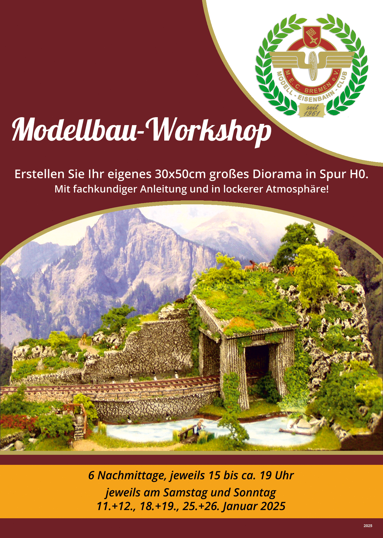 Unser Modellbau Workshop findet jährlich im Januar oder Februar statt und dauert 3 Wochenenden, jeweils Samstag und Sonntag von 15-19 Uhr. In lockerer Atmosphäre wird ein 30x50cm großes Diorama erstellt und diverse Techniken und Materialien vermittelt, um Ihre eigene Landschaft zu gestalten. Der Kostenbeitrag beträgt 135 Euro und enthält nebst einer bebilderten Anleitung auch sämtliche Materialien. Das erstellte Diorama gehört anschließend selbstverständlich Ihnen! Noch bis 15.12.2025 anmelden und 2026 dabei sein! -> |
